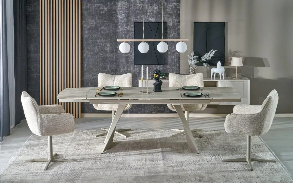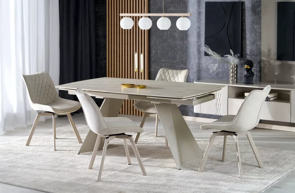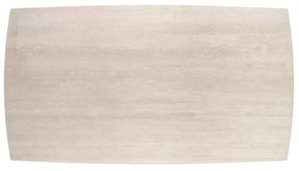 A szinterezett travertin színű asztallap elegáns, természetes kő ihlette mintázattal rendelkezik. Ez az anyag tartós, karc- és hőálló, mégis könnyen tisztítható, így tökéletes a mindennapi használatra. A világos kőfelület vizuális könnyedséget kölcsönöz az asztalnak, és nyugodt, természetes esztétikát visz a belső térbe.
