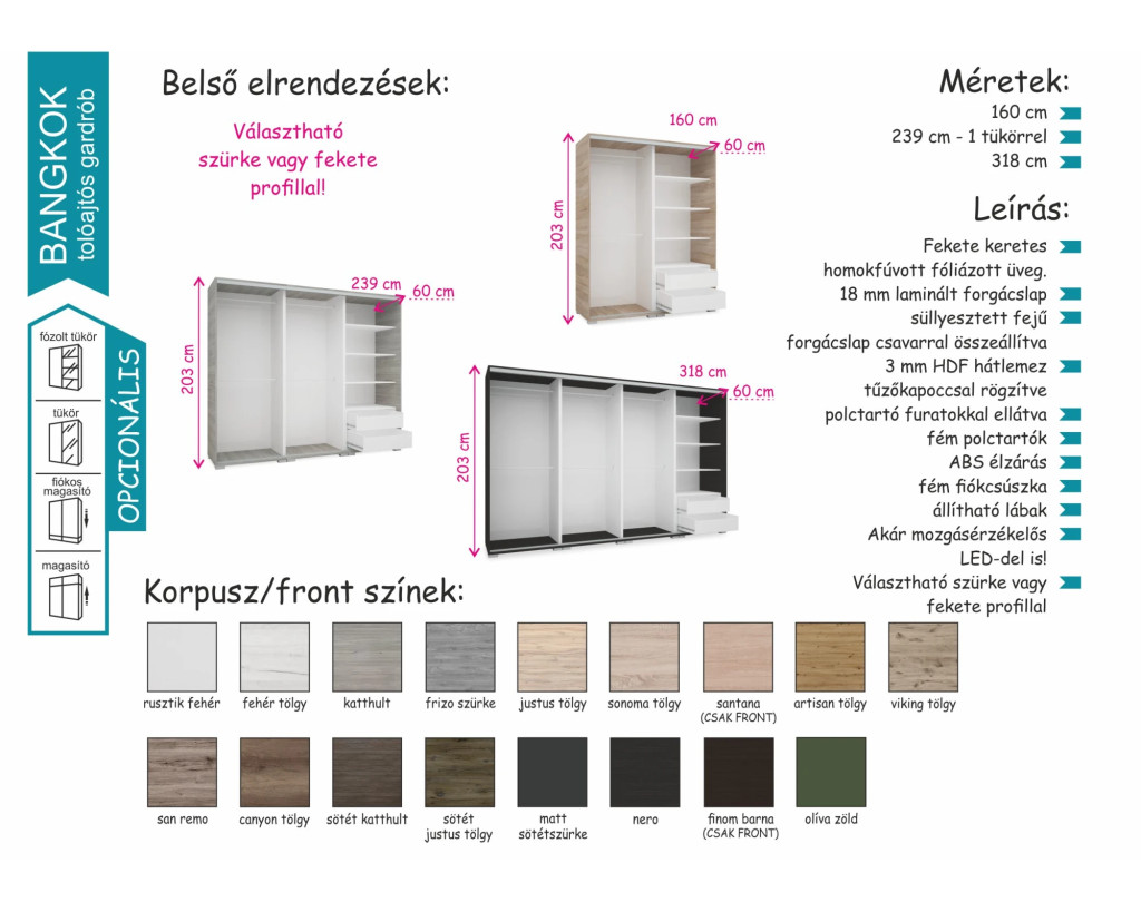 Bangkok tolóajtós gardróbszekrény 239 cm tükörrel