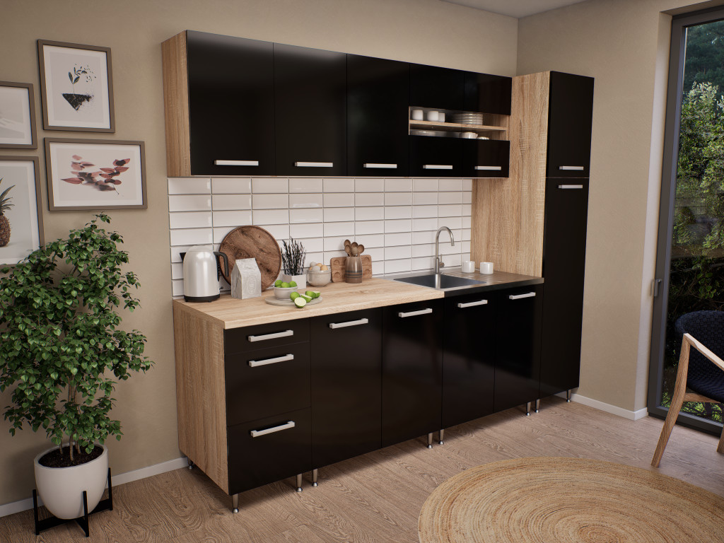 240 cm-es szériás komplett konyhabútor 60 cm-es felsõ elemekkel 1 medencés/csepegtetõs, teletetõs mosogatótálcával, szifonnal, munkalappal, szintező lábakkal. A fogantyúk és a lábak a szállítás miatt nincsenek felszerelve.