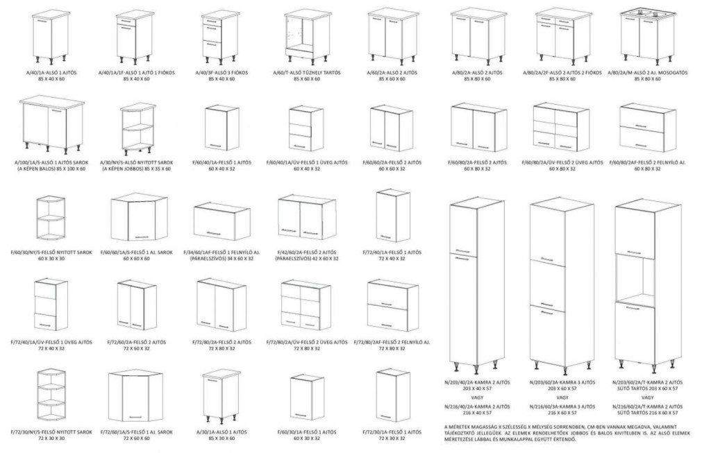 - Alsó elemek: magassága 85 cm, mélység 60 cm