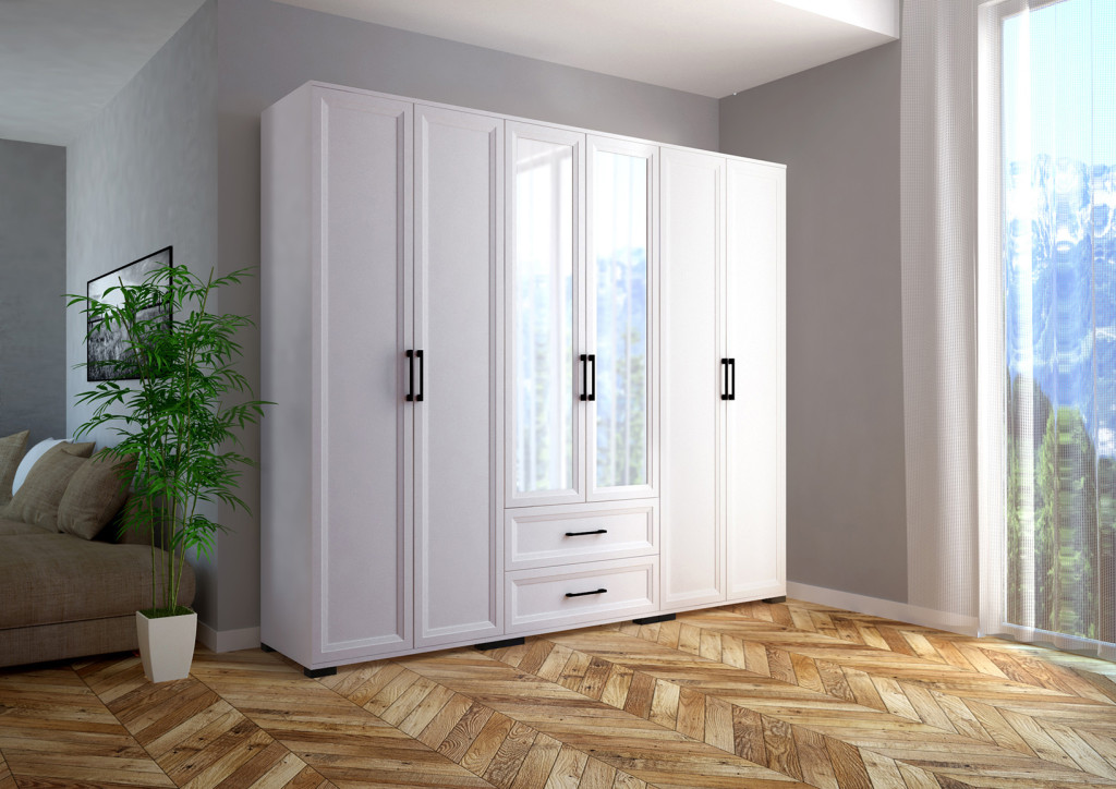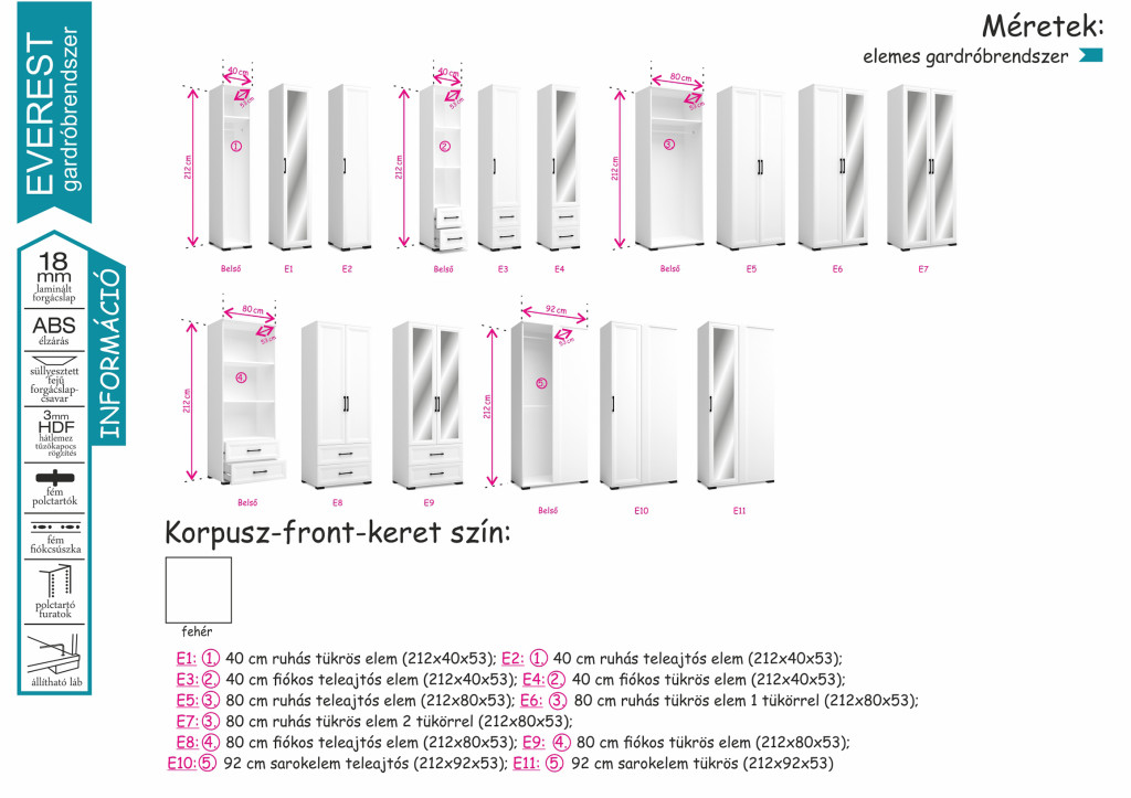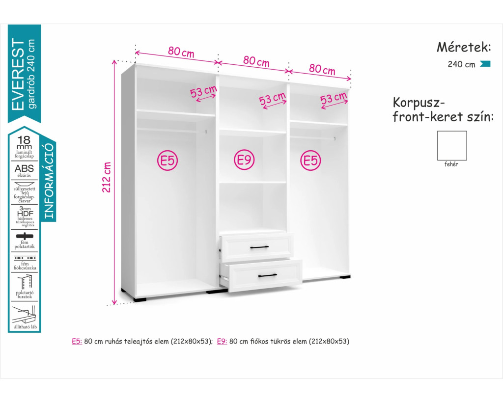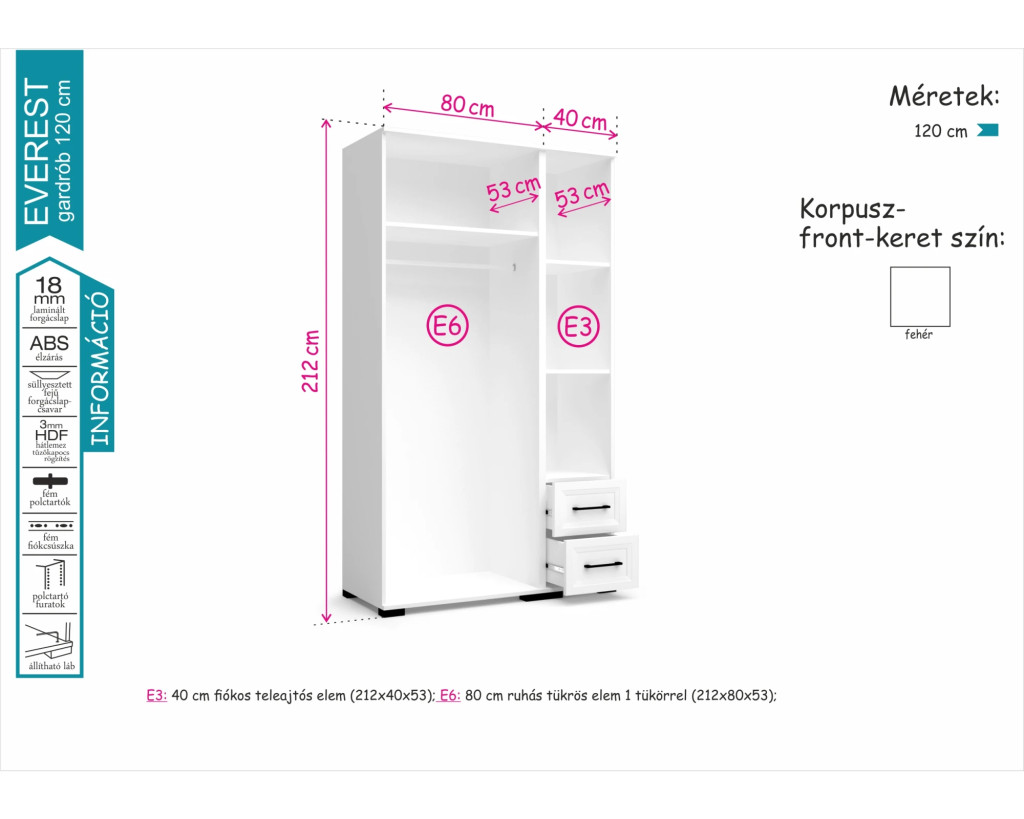 Az Everest gardrób egy praktikus és rugalmas tárolási megoldás, amely lehetővé teszi a ruhák és más tárgyak rendszerezett elhelyezését. A fehér színű, keretes gardróbnak elegáns megjelenést ad a fekete fogó és láb.
