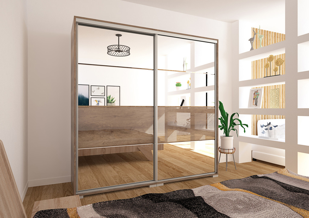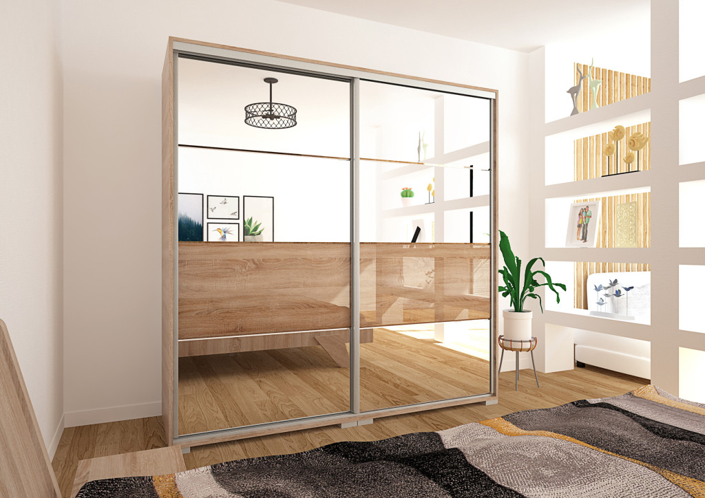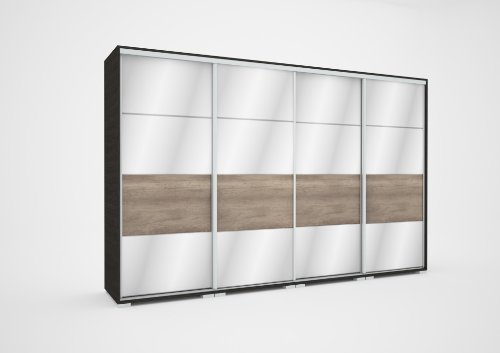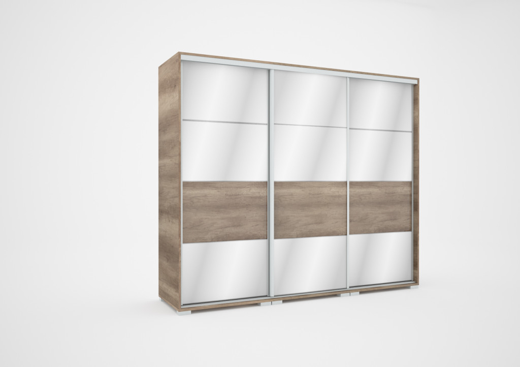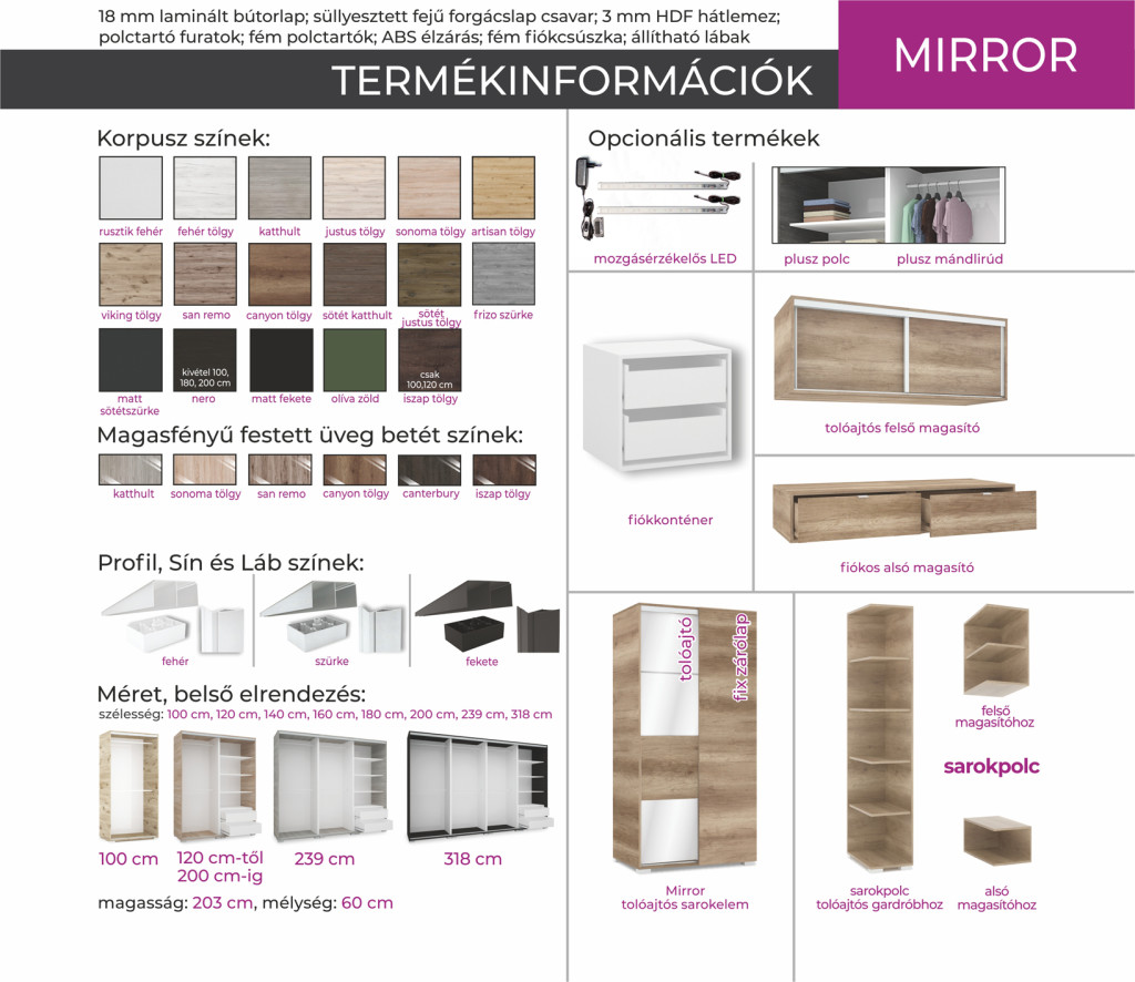 A Mirror gardrób fózolt tükrös frontjával és a harmadik sorba rendelhető különleges magasfényű famintás betétszíneivel igazán elegáns és letisztult termékünk. 100, 120, 140, 160, 180, 200, 239 illetve 318 cm-es kivitelben kapható.