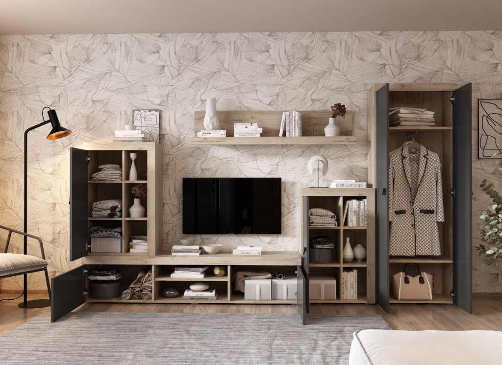 Az Ontario szekrénysor rendkívül praktikus bútordarabokból áll, sok rejtett tárolóhellyel és több nyitott polccal a könyvek, dísztárgyak számára.