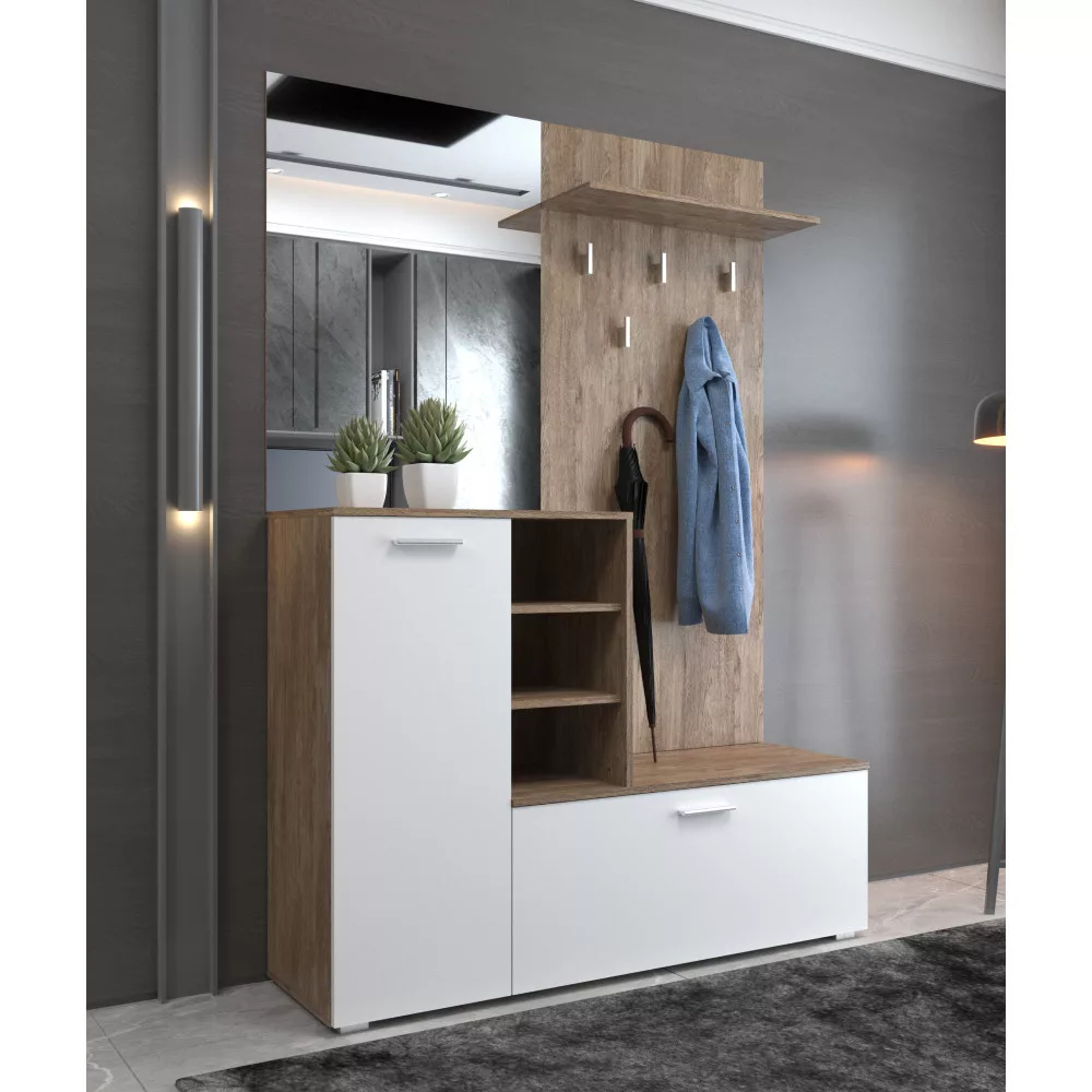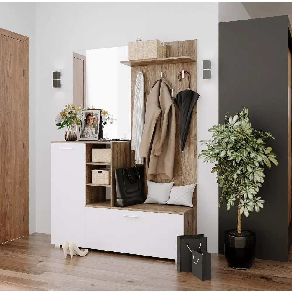 VETO előszobai szett elegáns és praktikus bútor minden előszobába. Az előszoba általában a legkisebb helyiség a házban, ugyanakkor ez az a hely, amely az első benyomást kelti. Előszobai készlet laminált faforgácsból készül, impregnált hőre keményedő polimerekkel kombinálva, amelyek az egyes elemek szélein helyezkednek el. A ansberg tölgy és a fehér tökéletes kombinációja az elegancia és a könnyedség érzetét kelti. A VETO készlet rengeteg tárhelyet kínál egy billentős cipősszekrény és ajtós szekrény formájában, amely mögött polc és nyitott tárolóhely bújik meg, valamint a része egy akasztós fal kampókkal. Az előszoba eleganciájáról a tükör gondoskodik, amelyben a házból való kilépés előtt megtekintheti magát. A VETO előszobai szett ideális választás azoknak, akik teljes és praktikus megoldást keresnek az előszobájukhoz anélkül, hogy feleslegesen kellene egyenként megvásárolniuk a bútorokat.