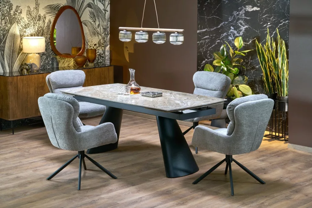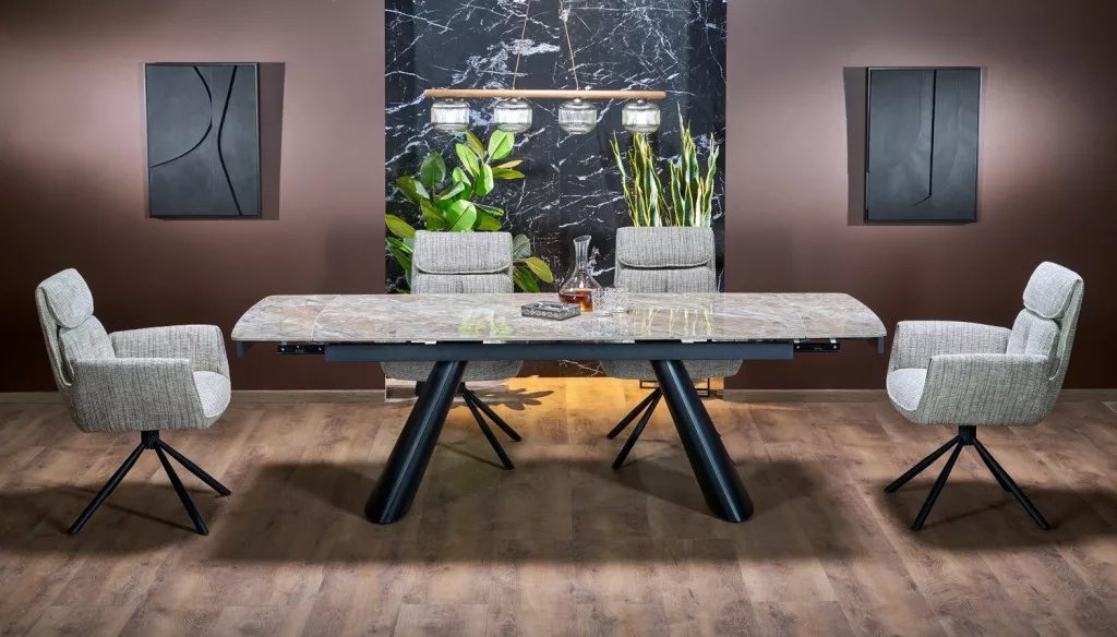 Fedezze fel a Vince étkezőasztal különleges kombinációját a természetes kőlap és a stabil fémváznak, amely tökéletes választás egy modern és funkcionális étkező kialakításához. Az asztal elegáns, téglalap alakú designja és a bővíthetőség miatt akár nyolc fő kényelmes elhelyezésére is alkalmas, így ideális családi vagy baráti összejövetelekhez.