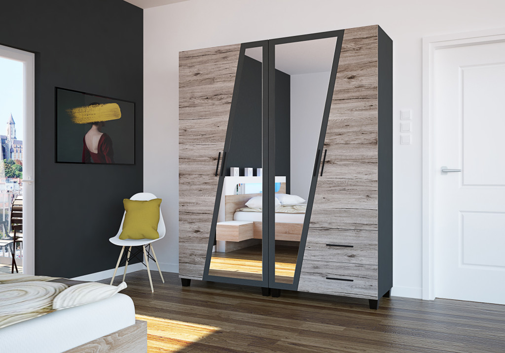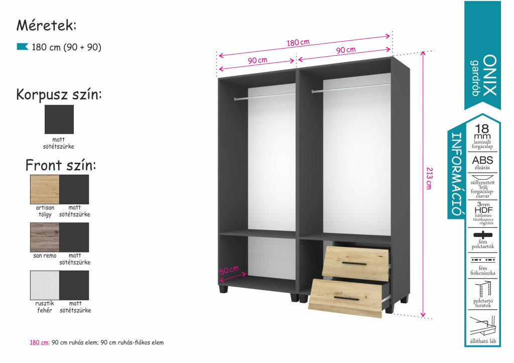 Az Onix gardrób egy méretben kapható. A 180 centiméteres kivitel jól kihasználható részekből épül fel. Az alsó 2 fiók, illetve az akasztós tárolórész nagyon sok ruha kényelmes elhelyezését teszi lehetővé. A tükrös ajtók a komfortos öltözködést segítik, és a teret is növelik a hálószobában.